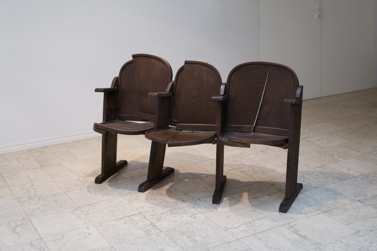 Perspective is a question that Krasimir Terziev frequently revisits. The seats in Film-theaters follow the model of the chirch - arranged in grid with all people seated, turned in the same direction (towards the screen or the altar). In this proposition the seats offer no common perspective.